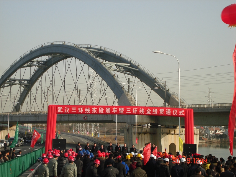 12月30日上午9時,長達9.64公里的武漢三環線東段(青化立交——老武黃公路)建成通車。至此,武漢三環線全線貫通。省市領導段輪一、阮成發、葉金生、劉家棟等出席通車儀式。集團公司相關領導及我公司分管該工程的領導率領公司20余人一同參加了本次通車典禮。