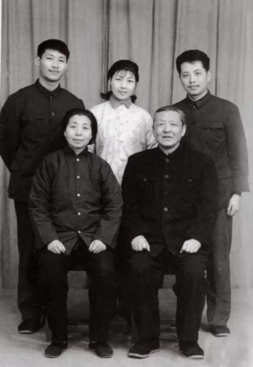 △1975年,習仲勛和齊心與兒女在洛陽紅旗照相館合影。后排左起:兒子習近平、女兒習安安、女婿吳龍。來源:《習仲勛畫傳》