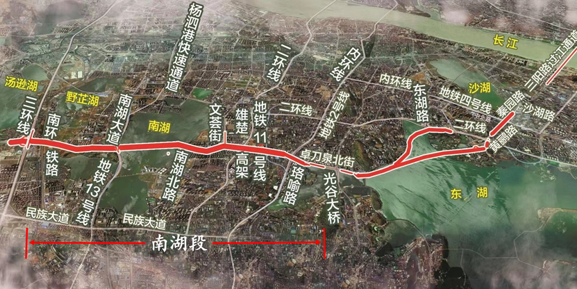 兩湖隧道(南湖段)項目起點位于洪山區卓刀泉北路主線入口,終點位于三環線地下互通南側,采用雙向六車道規模建設,主線長8.015km,設計時速50公里/小時。主體工程為道路、隧道工程,配套工程包括建筑、機電、管線綜合、橋梁、消防、逃生救援、交通安全設施、環境保護、景觀綠化等工程。兩湖隧道(南湖段)是目前國內最長、世界規模最大的城市湖底隧道,也是武漢市首個引入社會資本的雙層超大直徑隧道項目。項目估算金額約109.31億元,合作期24.5年,其中建設期4.5年,運營期20年。