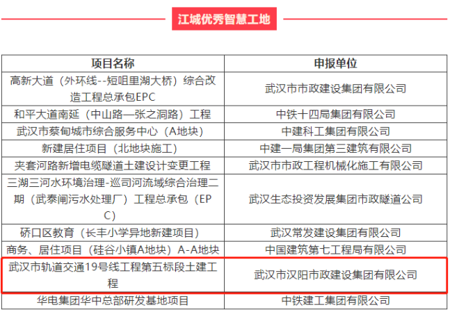 近日,由楚天都市報、武漢建筑業(yè)協(xié)會、武漢市建筑行業(yè)工會聯(lián)合會聯(lián)合主辦的2021年“創(chuàng)領智控杯”江城“雙十大”選樹結(jié)果揭曉,漢陽市政高新三路(三環(huán)線-外環(huán)線)改造提升工程總承包(EPC)獲評“江城十大智慧工地”,創(chuàng)智路、徑河路、徑河五路、徑河五路跨徑河橋、黃獅海東路工程總承包(EPC)獲評“江城文明工地”,武漢市軌道交通19號線工程第五標段土建工程獲評“江城優(yōu)秀智慧工地”。