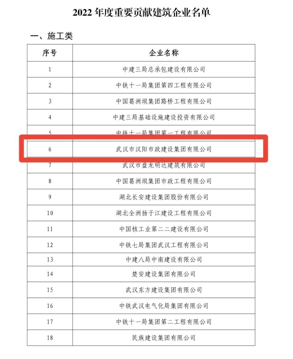 2月23日,湖北省住房和城鄉建設廳召開全省建筑業發展與管理工作會議,會上通報表揚26家突出貢獻企業和114家重要貢獻企業。漢陽市政榜上有名,獲評“湖北省2022年度重要貢獻建筑企業”。