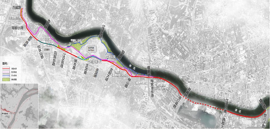 漢江南岸綜合治理工程EPC項(xiàng)目主要建設(shè)內(nèi)容為知音大道提升改造和漢水碧道建設(shè),項(xiàng)目估算總投資38.33億元。知音大道改造提升工程包含百威路至龍燈堤路段、江漢一橋至晴川小路段,道路長(zhǎng)約9.5km,紅線寬25至35m,雙向4車道,部分路段道路與堤防局部結(jié)合,采用橋梁形式上跨琴斷口小河,通道形式下穿龍陽(yáng)大道和京廣鐵路;新建和改造防汛道路約6.39km,并進(jìn)行路堤加固、防滲和防護(hù)處理,同步建設(shè)排水、交通、照明、綠化等配套設(shè)施。